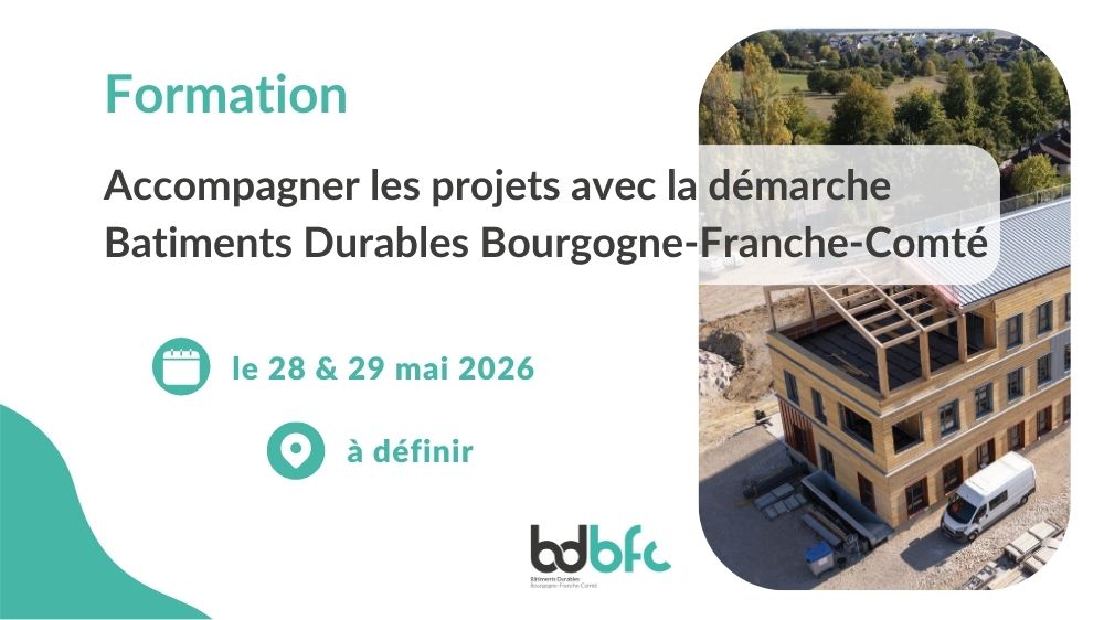 La 7ème session de la formation « Accompagner les projets avec la démarche Bâtiments Durables Bourgogne-Franche-Comté », organisée par le Pôle énergie BFC et Terragilis, aura lieu les jeudi 28 et vendredi 29 mai en Bourgogne-Franche-Comté (lieu à confirmer).
