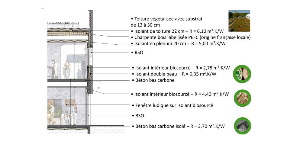 Il est recherché une compacité des bâtiments pour maîtriser et réduire les besoins en chauffage. Le projet s’attache également à favoriser l’emploi de matériaux biosourcés, notamment au premier étage du bâtiment de bureaux, qui sera réalisé en structure bois, et vise à réduire ses émissions de gaz à effet de serre en respectant la RE 2020 seuil 2025.