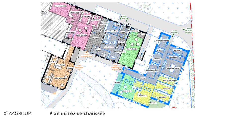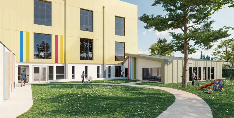 Des aménagements extérieurs sont projetés pour favoriser les interactions entre les espaces intérieurs et les espaces verts destinés aux enfants. Le site, déjà végétalisé initialement avec de nombreux arbres d’une belle hauteur, sera enrichi de nouvelles plantations qui participeront également à minimiser les apports solaires en été tant pour l’extension que pour les locaux existants.