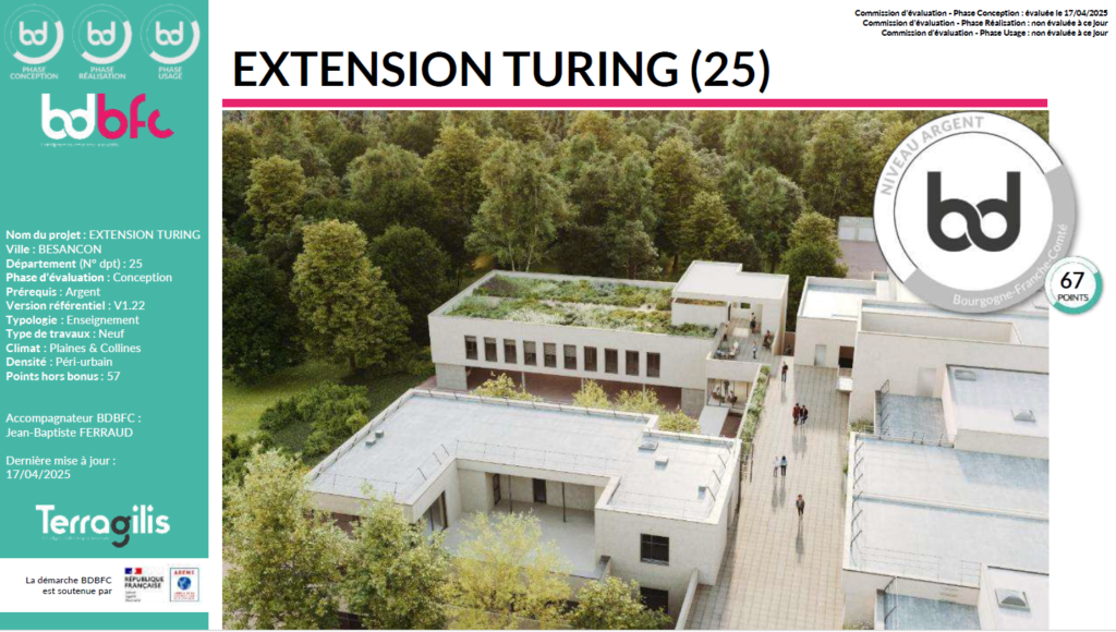 Le projet d’extension (300 m²) de l’école SUPMICROTECH, à Besançon, avec la création de salles informatiques a obtenu une médaille d’argent avec 67 points. Les membres de la commission ont attribué 10 points de cohérence durable. Ils ont salué l’engagement de la maîtrise d’ouvrage pour minimiser l’impact sur le site et les espaces végétalisés ainsi que l’emploi de matériaux biosourcés.